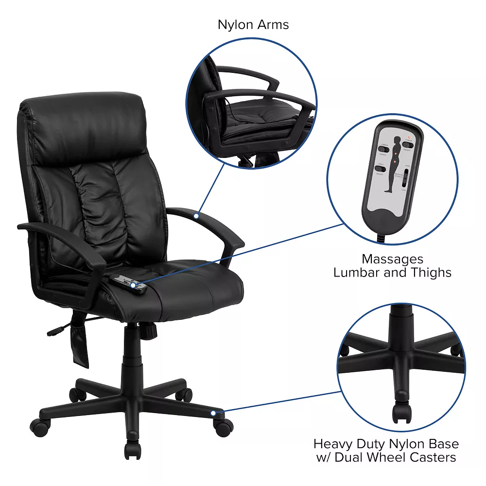 Enjoy a relaxing massage in the privacy of your own office with this incredibly comfortable LeatherSoft upholstered massaging executive office chair. The included remote has a variable slider intensity mode to get to your desired comfort level and has a designated side pocket when not in use. LeatherSoft is leather and polyurethane for added softness and durability. Finding a comfortable chair is essential when sitting for long periods at a time. Having the support of an ergonomic office chair may help promote good posture and reduce future back problems or pain. High back office chairs extend to the upper back for greater support and relieve tension in the lower back, preventing long term strain. The tilt lock mechanism rocks/tilts the chair and locks in an upright position while the tilt tension adjustment knob adjusts the chair’s backward tilt resistance. The waterfall front seat edge removes pressure from the lower legs and improves circulation. Chair easily swivels 360 degrees to get the maximum use of your workspace without strain. The pneumatic adjustment lever will allow you to easily adjust the seat to your desired height.