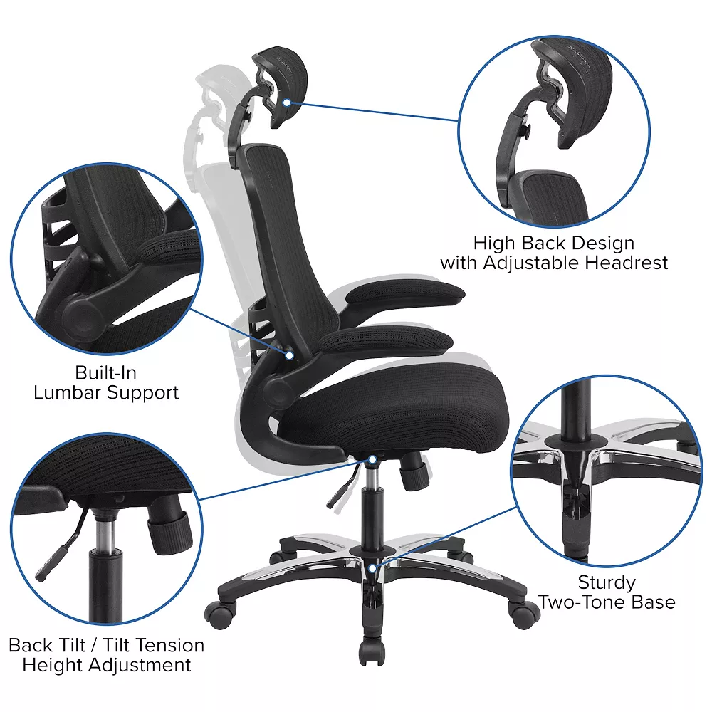 With its two-tone black nylon and chrome base, this comfortable desk chair with wheels lends a contemporary style to any space. The thick-padded seat and ventilated mesh material allow air to circulate without restriction, keeping you cool and comfortable, even when sitting for long periods of time. This swivel chair rotates 360 degrees and easily lowers and raises with a pneumatic seat height adjustment lever to deliver the perfect fit every time. Its flip-up arms provide the option of an armless office desk chair design ideal for projects that require a free range of motion, while the swivel chair’s adjustable headrest helps to support the neck. The tilt-lock mechanism allows users to enjoy a relaxing rocking or reclining motion while taking a quick break from working on the computer or answering phones. Featuring functional construction that doesn’t compromise on style, this high-back mesh office chair has: – Dual-wheel casters that roll smoothly over hard or carpeted surfaces. – A tilt tension adjustment knob that locks the chair in place. – Ergonomic construction that keeps the back supported and the body properly aligned during work sessions. – Fire-retardant foam filling that promotes increased safety without compromising on comfort. Designed to ensure extra comfort and support, our high-back executive office chair also features a waterfall seat edge made to remove pressure from the lower legs while improving circulation. Upgrade your work area with our high-back office chair featuring an attractive contemporary design and built-in lumbar support to help keep you productive and focused from task to task.