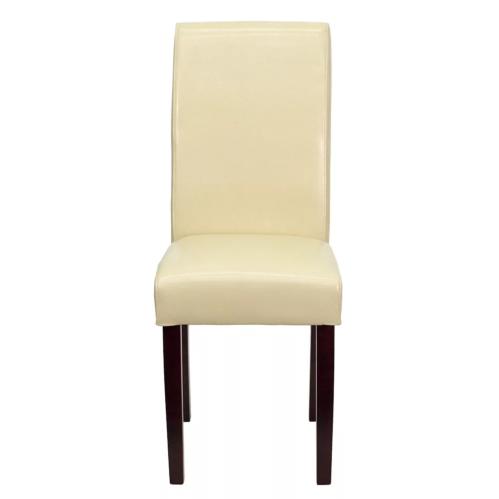 Less is definitely more with the simple but classic design of this ivory LeatherSoft upholstered parsons chair. LeatherSoft is leather and polyurethane for added softness and durability. Sleek lined panel stitching and a mahogany frame finish make this chair an elegant addition to your home, or home office. The armless design gives the illusion of space which appeals in small spaces.Strength and durability abound int his timeless piece that is built to last. High density foam padding over solid hardwood frame construction ensures the longevity of this accent chair. Parsons chairs are versatile and can be used not only in the dining room and kitchen but also as a reading chair or extra seating in the living room. Assembly takes less than 30 minutes with the included materials. Make quick work of spills and maintain the appearance of this side chair with a water based cleaner.