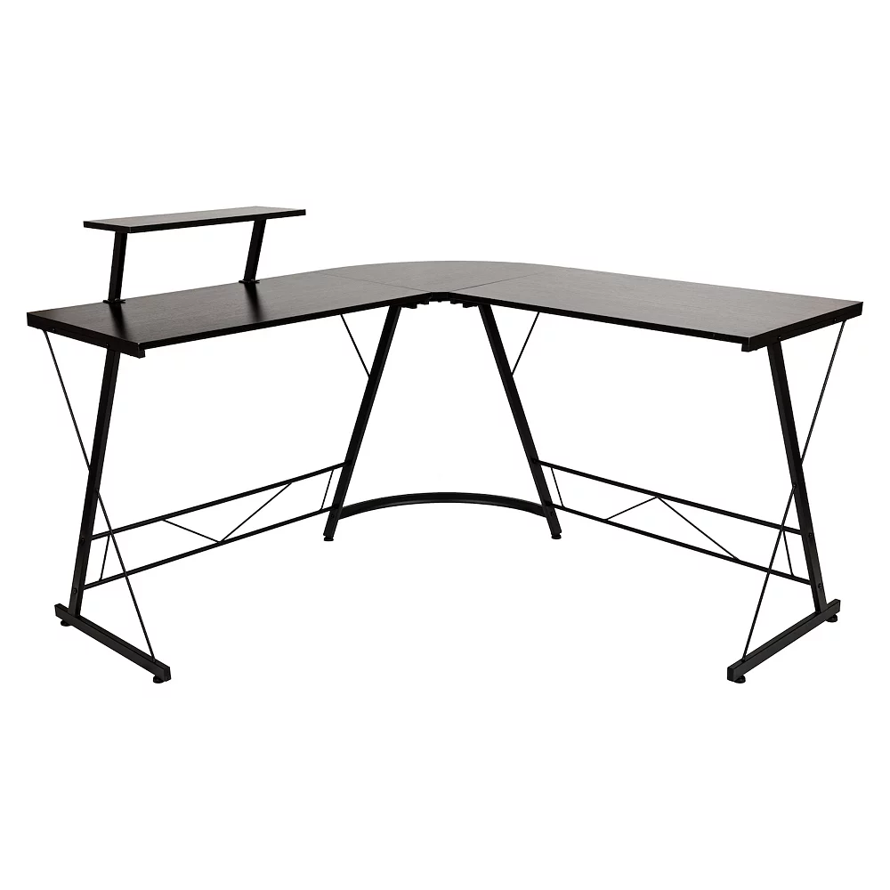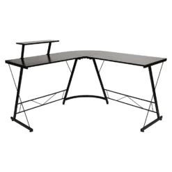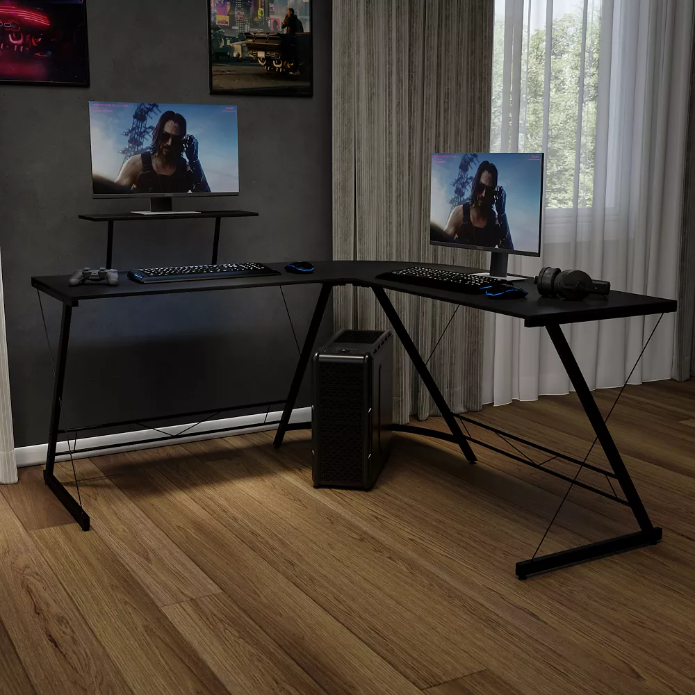 - L-Shaped desktop provides large surface for computer accessories or gaming consoles