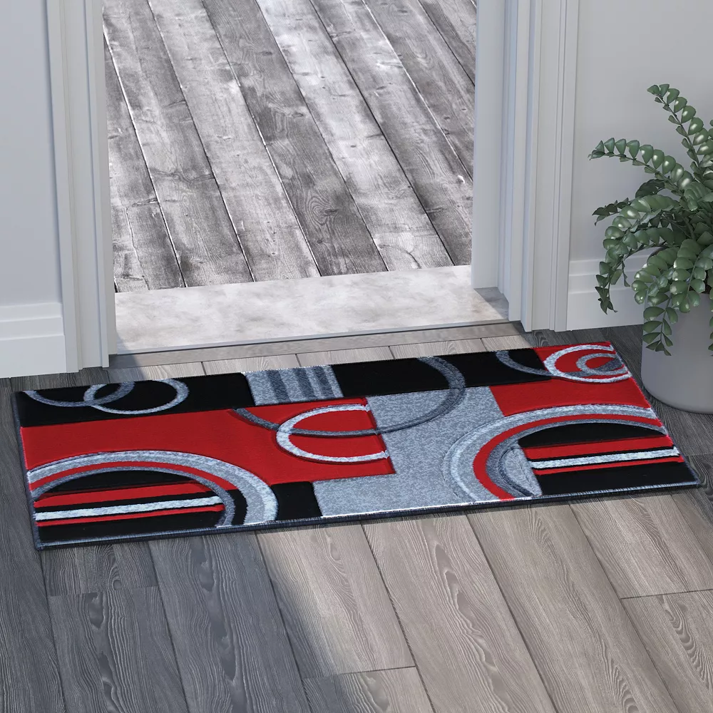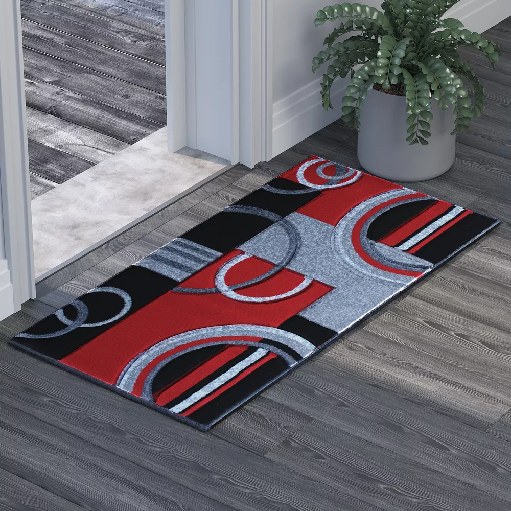 Spice up your home with this ultra soft accent rug. Featuring a modern geometric pattern in vibrant red, gray, black and white, this rug will add a dash of bold design to any room in your home. Available in multiple sizes, you can carry this design throughout your home for a cohesive look. The plush olefin facing has a unique 3D sculpted look to add texture and interest to your decor. Olefin is naturally moisture and stain resistant as well as colorfast and non-shedding making it a perfect choice for homes with pets or children. The durable jute backing is suitable for multiple flooring types. To keep your rug looking fresh, vacuum regularly and spot clean when needed with a diluted mixture of clear, neutral detergent and water and a dry cloth. For larger messes, the rug can be steam cleaned, but should not be exposed to prolonged, excessive moisture.