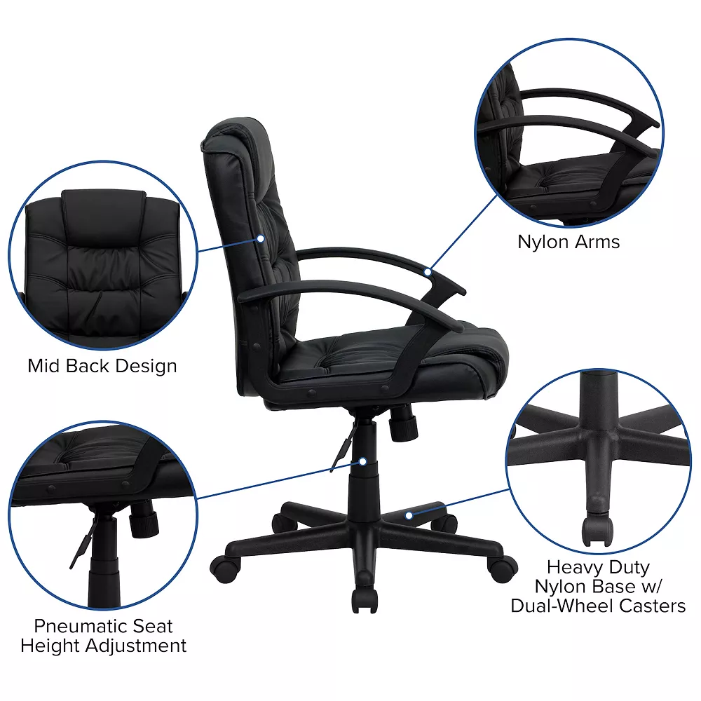 Upgrade your office seating with this mid-back black LeatherSoft upholstered swivel task office chair. A mid-back office chair offers support to the mid-to-upper back region. Chair easily swivels 360 degrees to get the maximum use of your workspace without strain. LeatherSoft is leather and polyurethane for softness and durability. The tilt lock mechanism rocks/tilts the chair and locks in an upright position while the tilt tension adjustment knob adjusts the chair’s backward tilt resistance. The pneumatic adjustment lever will allow you to easily adjust the seat to your desired height. This computer chair is perfect for the office or in the home. From behind the desk to the meeting room this chair can provide a seamless addition to your work space.