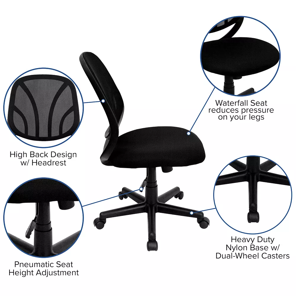 Why go when this supremely comfortable task office chair makes you want to stay? The Y-GO task chair features a black mesh back with flex bars which conform to the natural curve of the user’s back. Mesh office chairs can keep you more productive throughout your work day with its comfort and ventilated design. The breathable mesh material allows air to circulate to keep you cool while sitting. The mid-back design offers support to the mid-to-upper back region. The waterfall front seat edge removes pressure from the lower legs and improves circulation. Chair easily swivels 360 degrees to get the maximum use of your workspace without strain. The pneumatic adjustment lever will allow you to easily adjust the seat to your desired height. The flex back with the padded foam seat makes this a valuable addition to any home office, professional office or school business department.