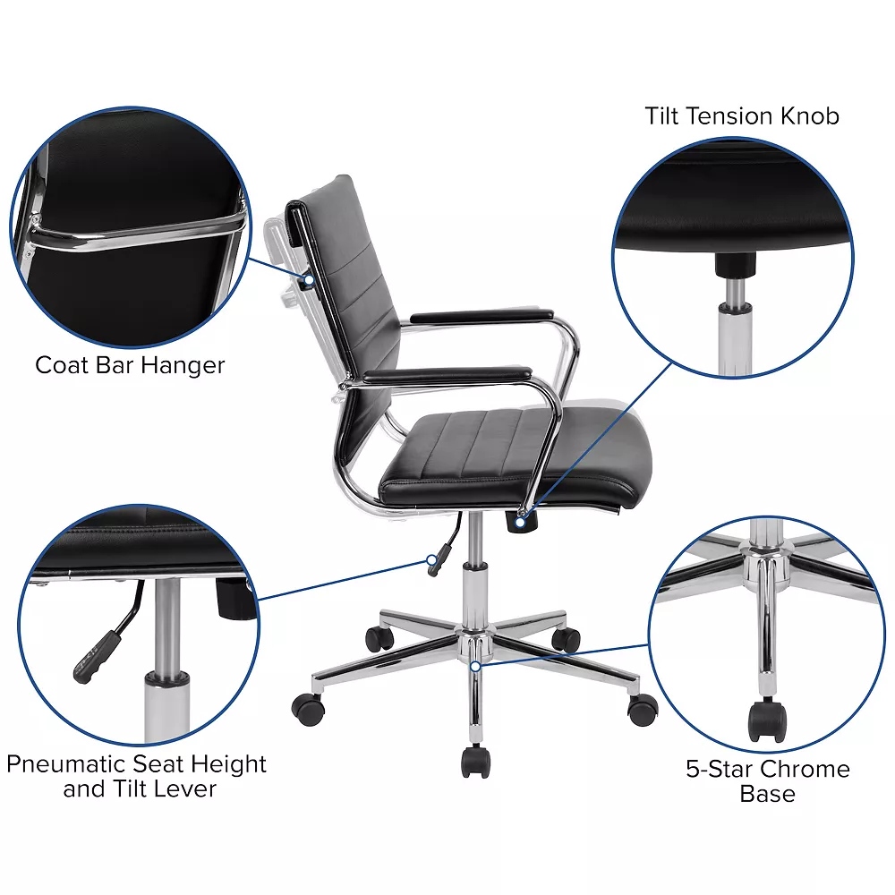 Prioritize reviving your business offices with fresh paint, contemporary light fixtures, and this ribbed office chair for every office and cubicle. You’ll fall into comfort with the ribbed back desk chair backed by curved lumbar support. An integrated back bar provides a convenient position to hang garments such as coats and jackets. Take the pressure off your shoulders and neck by resting your arms on the integrated padded arms that are framed by a glossy chrome finish. Adjust the chair to your desired height by utilizing the lever underneath the seat that also locks the chair in an upright position. When you want to lean back pull the lever out and use the knob to adjust the force that’ll be required to recline. Lessen pressure from your lower legs with the waterfall seat edge which improves circulation. Redesign your hotel business center, meeting room or home office with this mid-back desk chair to carry your space into the new century. Coordinate your entire office with our armless and high back versions.