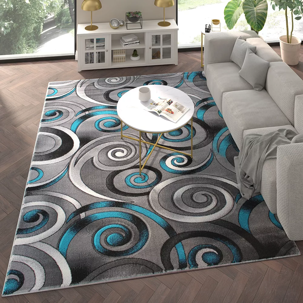 Bring style and comfort to any room in your home with this ultrasoft accent rug. A hand sculpted 3D swirling pattern in vibrant turquoise, gray and black catches the eye and adds a splash of color to your space without being overwhelming. If you live in a busy household, the upkeep of this rug will be an added bonus. The olefin facing is naturally water resistant and colorfast with non-shedding fibers. Simply vacuum regularly without the roller brush to remove debris. Spot clean when needed with a diluted mixture of clear neutral detergent and water and a dry cloth. If there’s a major spill, the rug can be steam cleaned but shouldn’t be exposed to excess moisture to help keep it in its best condition. Blending high style and low maintenance, this rug is the ideal statement piece for any room in your home.