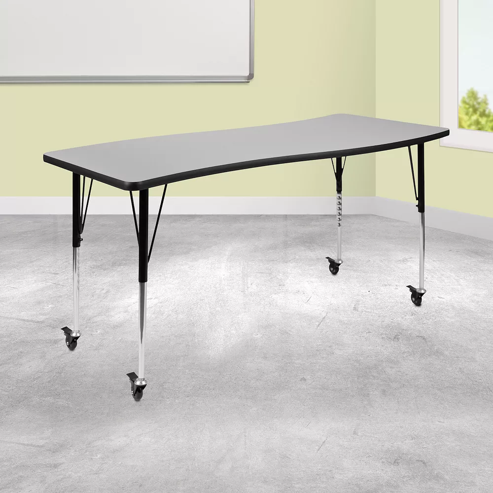 Are you a teacher who hates the look of a stale environment? Change the look in your classroom without breaking a sweat with mobile activity tables you can move yourself after school or have your students rearrange at will for effective group collaborations. Modern wave activity tables are designed to nest together to grow with the size of your groups. Students feel more encouraged to work in groups with furnishings designed for collaboration. Built to last through many class turnovers the thermal fused laminate top is scratch, stain and warp resistant. An attractive black powder coated finish protects the upper legs from scratches and height adjustable chrome lower legs give you the flexibility to raise or lower the table a full 8 in 1 increments. Locking casters allow you to lock each caster as needed to move or lock in place. Mix various shaped nesting activity tables around the classroom for better interaction between students as well as helping to define workspaces. This table accommodates four 16 or 18 seat ergonomic shell stack chairs. For the ultimate classroom setup add our soft seating collaborative circle and moon shaped ottomans to add color and safety. Collaboration doesn’t happen only in the classroom, add this office group table in your conference room or collaborative space for team members to gather around.