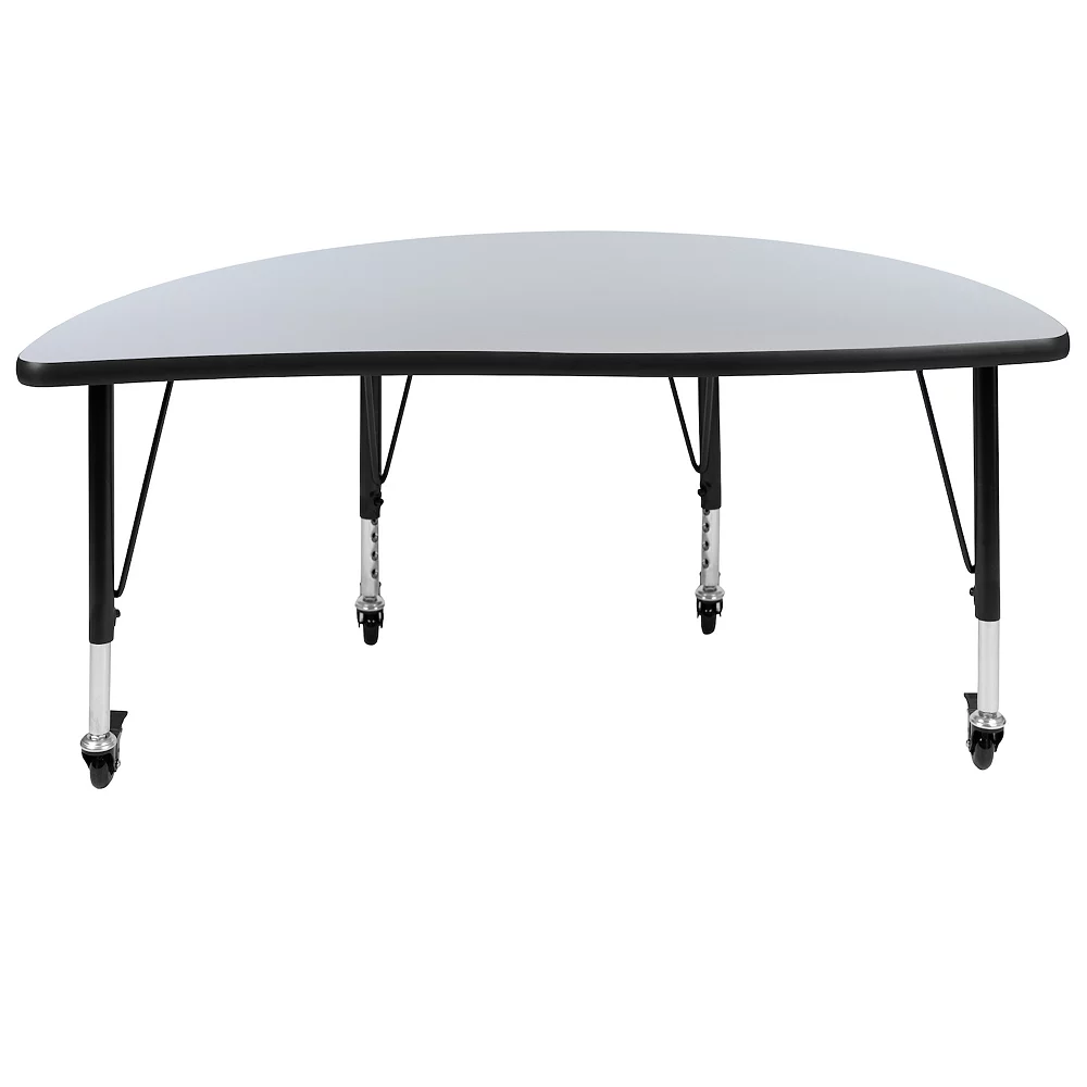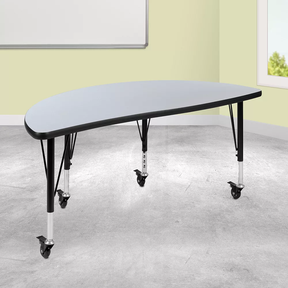 Develop young kids social skills with collaborative wave activity tables that encourages working together. Change the look in your classroom without breaking a sweat with mobile activity tables you can quickly move yourself. Nest two or more activity tables together as your groups become larger. Built to last through many class turnovers the thermal fused laminate top is scratch, stain and warp resistant. An attractive black powder coated finish protects the upper legs from scratches and height adjustable chrome lower legs give you the flexibility to raise or lower the table a full 8 in 1 increments. Locking casters allow you to lock each caster as needed to move or lock in place. Mix various shaped activity tables around the classroom for kids to interact and define workspaces. This table accommodates four 12 or 14 seat plastic stackable school chairs or ergonomic shell stack chairs around its frame. For the ultimate classroom setup add our soft seating collaborative circle and moon shaped ottomans to add color and safety.