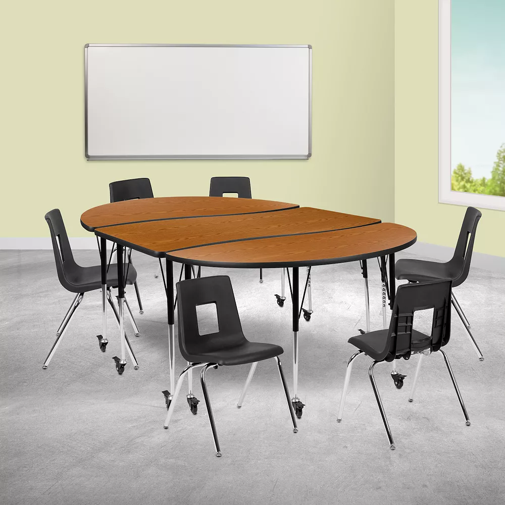 Rearrange your classroom without breaking a sweat with this collaborative mobile table set. Group settings encourage students to interact to work towards a common goal. You can create unlimited combinations using various shapes and colors. With our ergonomic shell student chairs included there is no need to shop around. Practical for any class setting this school table group will last you for many years with its durable thermal fused laminate top that is scratch, stain and warp resistant. Height adjustable chrome lower legs give you the flexibility to raise or lower the table. Locking casters allow you to lock each caster as needed to move or lock in place. Purchase our pre-built table and chair bundle for your classroom, home, rec center, or other public gathering facilities. The plastic stack chairs with 18 seat height are ideal for middle, high school and college students. You can create a collaborative workspace out of your conference room to grow work relationships by having teams meet regularly in a group setting.