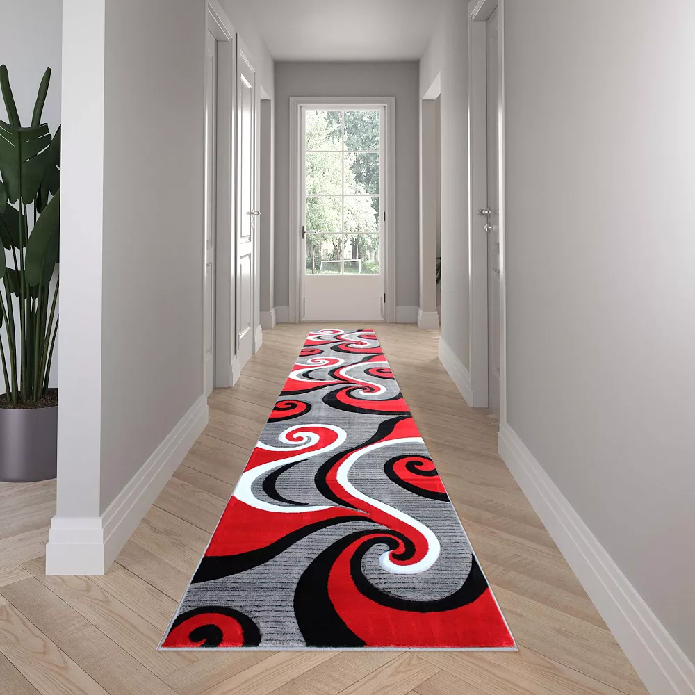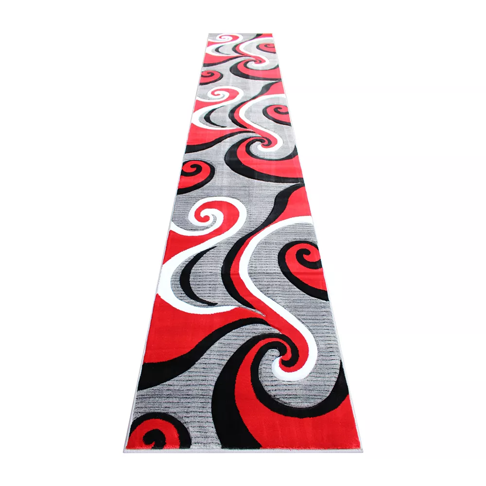 Bring your home into the modern age with this beautifully detailed accent rug. Featuring an abstract swirl pattern with 3D sculpted effect and different pile lengths for texture variation in a pleasing palette of red, black, gray and white, this rug can seamlessly fit with any decor. The colors are vibrant and true and the different textures draw the eye and give a unique look sure to be noticed by your guests. Olefin facing offers soft comfort underfoot and low maintenance cleaning and care. Naturally water and stain resistant, this rug only needs regular vacuuming to stay looking beautiful. For small spills, blot with a dry cloth and spot clean if needed with a diluted mixture of clear, neutral detergent and water. For heavy soiling, the rug can be steam cleaned, but shouldn’t be exposed to excess moisture. The jute backing is durable and suitable for multiple flooring types.