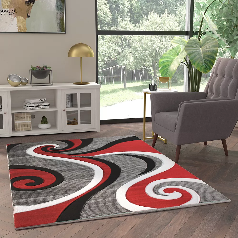 Bring your home into the modern age with this beautifully detailed accent rug. Featuring an abstract swirl pattern with 3D sculpted effect and different pile lengths for texture variation in a pleasing palette of red, black, gray and white, this rug can seamlessly fit with any decor. The colors are vibrant and true and the different textures draw the eye and give a unique look sure to be noticed by your guests. Olefin facing offers soft comfort underfoot and low maintenance cleaning and care. Naturally water and stain resistant, this rug only needs regular vacuuming to stay looking beautiful. For small spills, blot with a dry cloth and spot clean if needed with a diluted mixture of clear, neutral detergent and water. For heavy soiling, the rug can be steam cleaned, but shouldn’t be exposed to excess moisture. The jute backing is durable and suitable for multiple flooring types.