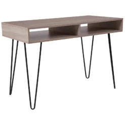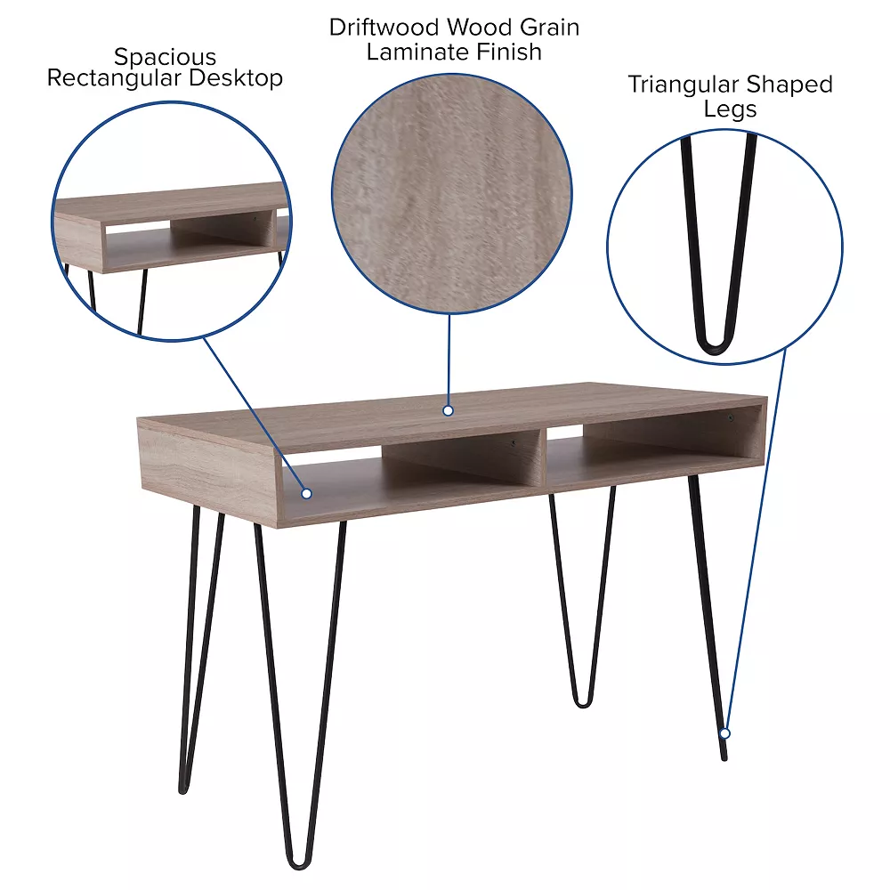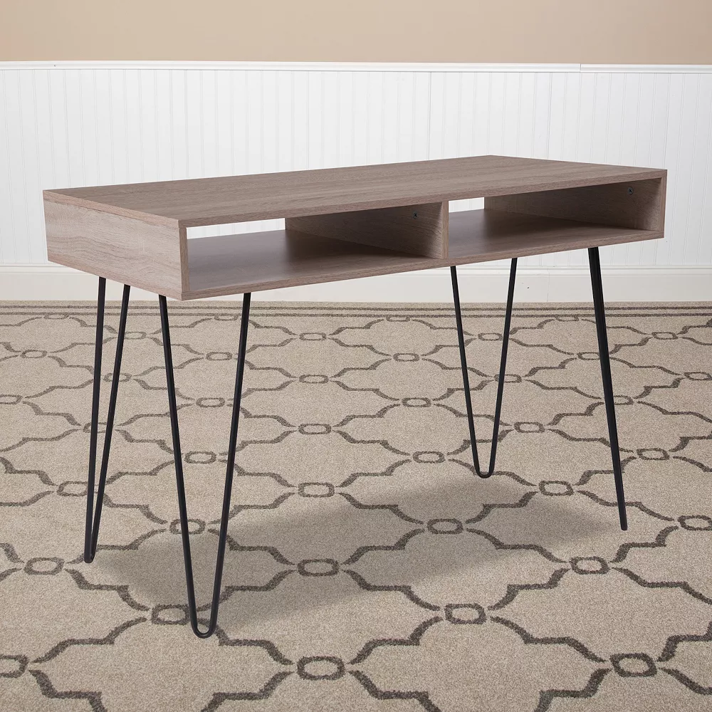 Add a workspace to your home office or living room that adds a fun, trendy look without taking up valuable space. Streamlined style and eye-catching good looks meet in this mid century computer desk. This clean looking desk features a large writing surface and open shelving to hold your writing utensils and papers when not in use for a neat appearance. Triangular shaped legs add to the beauty of this desk. The appealing design of this desk will complement any work space. Keep this piece looking great with a water-based cleaner.
