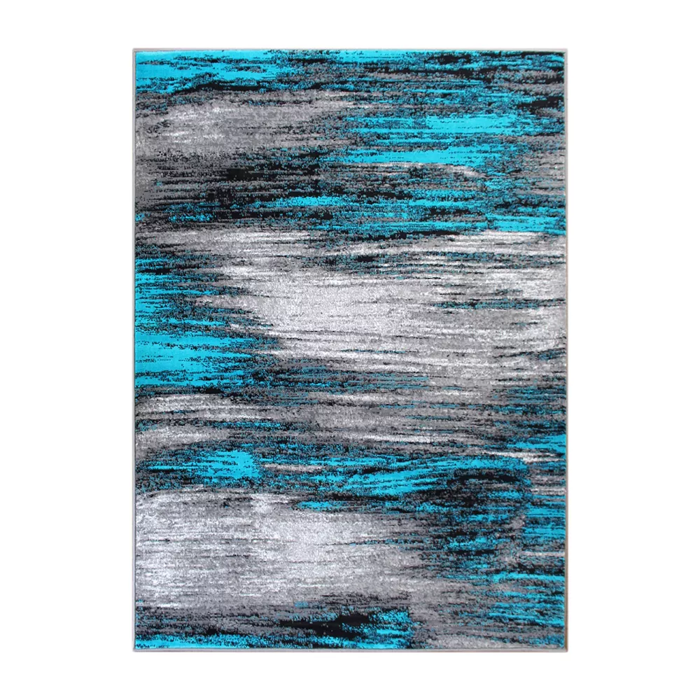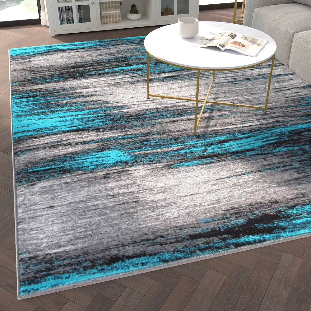 Simple and modern come together in this decorative accent rug. Featuring a shaded look design in gradient shades of gray, black and turquoise, this rug is just the finishing touch you need to complete your home refresh. With ultra soft olefin facing, this rug is as comfortable as it is pretty. Your family can snuggle up on this rug for movie or game night without worrying about drops or spills. The fibers of this rug are water and stain resistant, colorfast and non-shedding for lasting beauty. To clean, vacuum regularly without a roller brush. For spills, spot clean with a mixture of clear, neutral detergent and water with a dry cloth. For bigger messes, you can steam clean this rug, but should avoid exposing it to excessive moisture to keep it looking great longer. The natural jute backing is suitable for multiple flooring types.