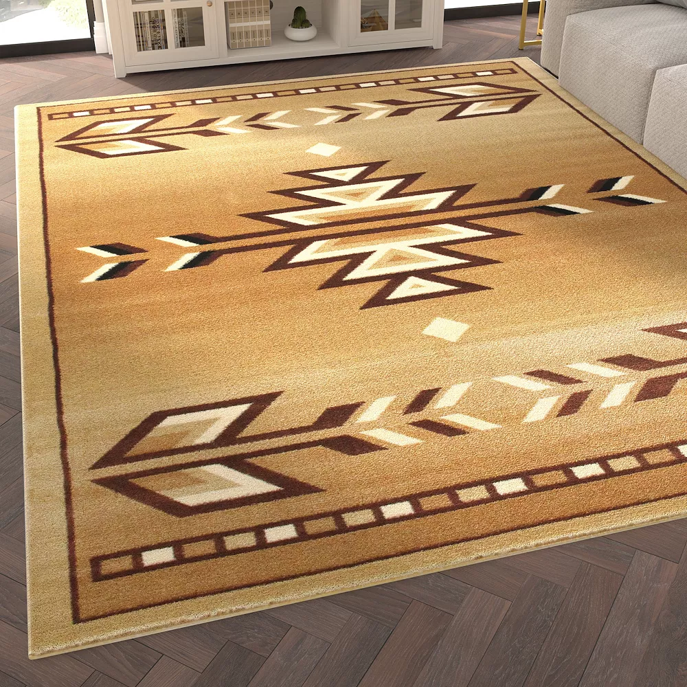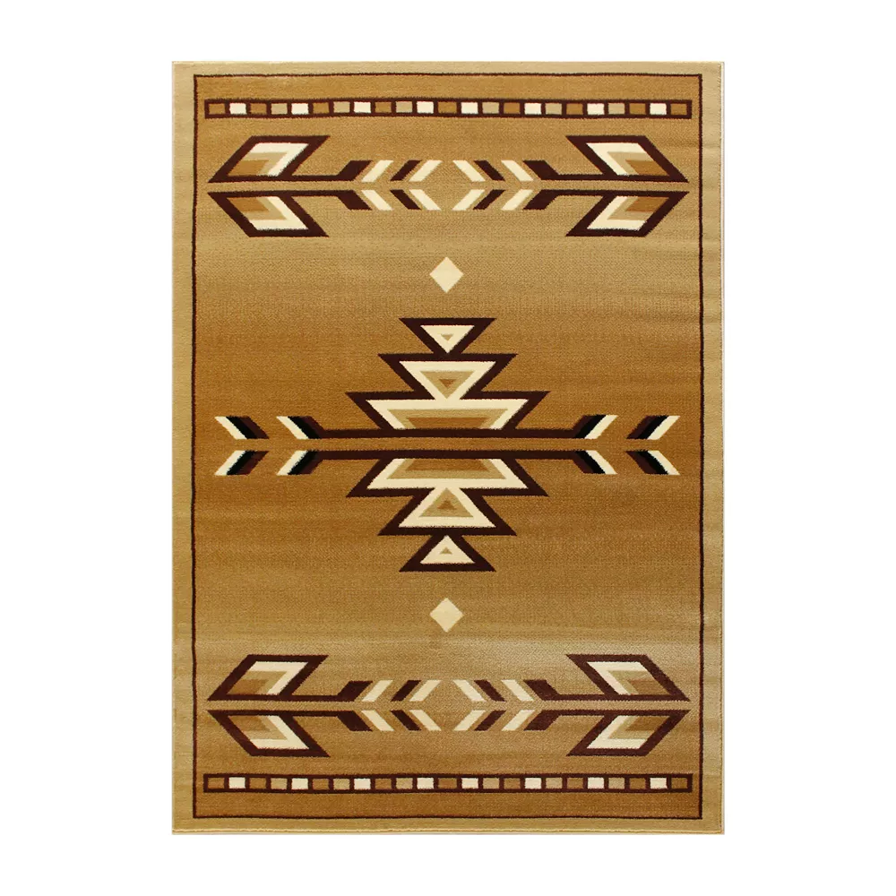 Bring rustic style to your home, cabin or RV with this olefin accent rug. Featuring a Southwestern arrow motif in beige, black and ivory set against a rich, brown background, this rug brings the spirit of the open plains to your living space. Naturally moisture and stain resistant, this rug is ideal for hunting lodges, cabins and RV’s and with the easy clean up, you can spend more time outdoors enjoying what you love. Simply vacuum regularly and spot clean small spills or messes with a diluted mixture of clear, neutral detergent and water and a cloth. If you tracked the outdoors in, steam clean on the lowest moisture setting to refresh your rug and keep it looking newer longer. The natural jute backing is versatile to suit multiple flooring types for your convenience. A perfect blend of style and practicality, this rug was made for your lifestyle.