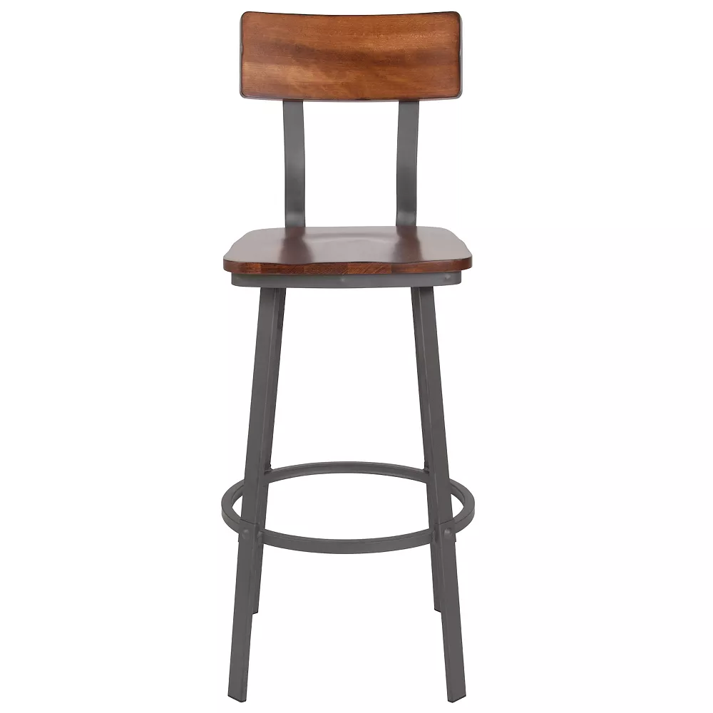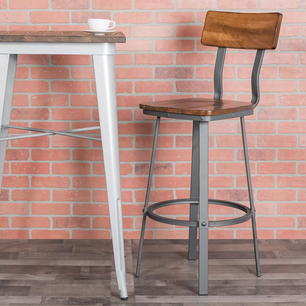 Set a new trend with this modern-industrial style metal restaurant barstool that will become a staple at your home or restaurant bar. This Rustic Walnut Restaurant Barstool with Wood Seat and Back and Gray Powder Coat Frame is attractively designed with a rectangular wood back. A round foot ring adds durability and serves as a footrest. Plastic floor glides protect your floors by sliding smoothly when you need to move the chair. This commercial grade stool will look great in cafes, bars, and other food-service settings with an industrial or rustic decor. To bring the look together in your restaurant, pair with matching chairs for your dining tables.