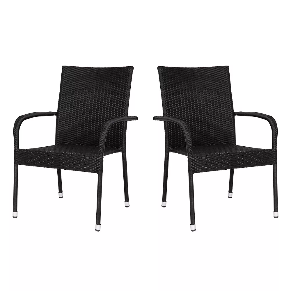 Create a custom outdoor seating or dining area with this set of four woven wicker patio chairs in black. The modern polyethylene wicker is durable and weather resistant for lasting use and the sturdy powder coated steel frame is resistant to rust and corrosion making it perfect for outdoor use. A curved back and integrated armrests encourage lounging and offer unsurpassed comfort for all of your guests. Looking for a unique touch inside? Use these chairs as dining or accent chairs and make any home feel like a beach vacation. Shipped preassembled and ready to use for your convenience, backyard parties are quickly within reach. These chairs stack up to four high for easy storage when not in use. Pair with one of our wicker and acacia wood tables for a complete look. For easy cleaning, simply wipe down with a damp cloth.