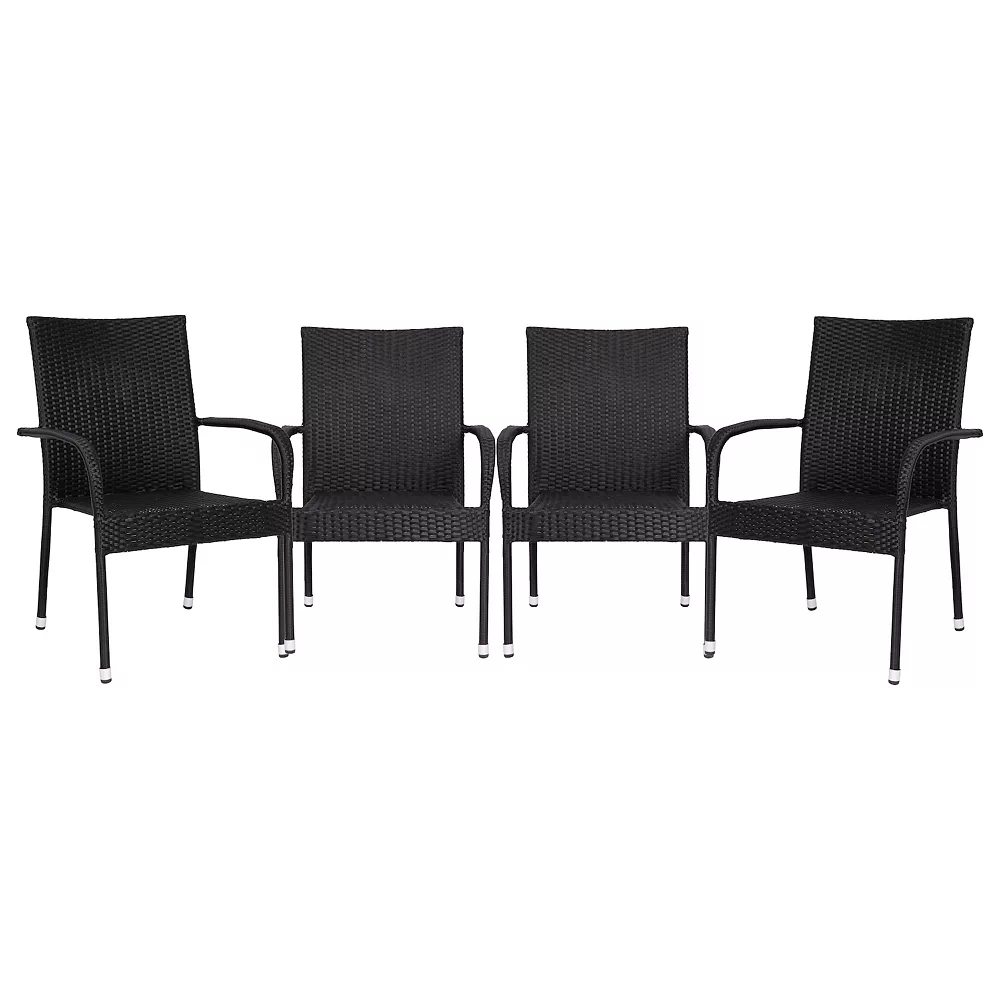 Create a custom outdoor seating or dining area with this set of two woven wicker patio chairs in black. The modern polyethylene wicker is durable and weather resistant for lasting use and the sturdy powder coated steel frame is resistant to rust and corrosion making it perfect for outdoor use. A curved back and integrated armrests encourage lounging and offer unsurpassed comfort for all of your guests. Looking for a unique touch inside? Use these chairs as dining or accent chairs and make any home feel like a beach vacation. Shipped preassembled and ready to use for your convenience, backyard parties are quickly within reach. These chairs stack up to four high for easy storage when not in use. Pair with one of our wicker and acacia wood tables for a complete look. For easy cleaning, simply wipe down with a damp cloth.