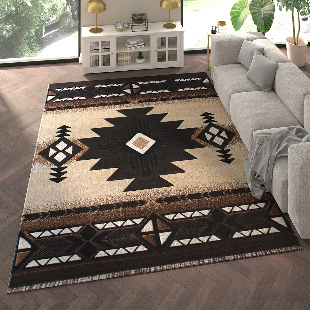 If you’re a fan of Western aesthetics, this is the rug of your dreams. Featuring a vibrant Southwestern geometric pattern against a rich berber background, this rug will tie all of your favorite design elements together and complete your Western themed room. The olefin facing is moisture and water soluble stain resistant for your peace of mind. Olefin is also non-shedding and colorfast to last for years to come. The high density fibers give the rug an ultra soft feel underfoot and protect from the chill of cold flooring surfaces such as hardwood and tile. To care for this rug, simply vacuum regularly without a brush roller or spot clean with a diluted solution of clear, mild detergent and water and a dry cloth. Spills should be blotted with a dry cloth. In case of heavy soiling, the rug can be steam cleaned, but shouldn’t be exposed to excessive moisture.