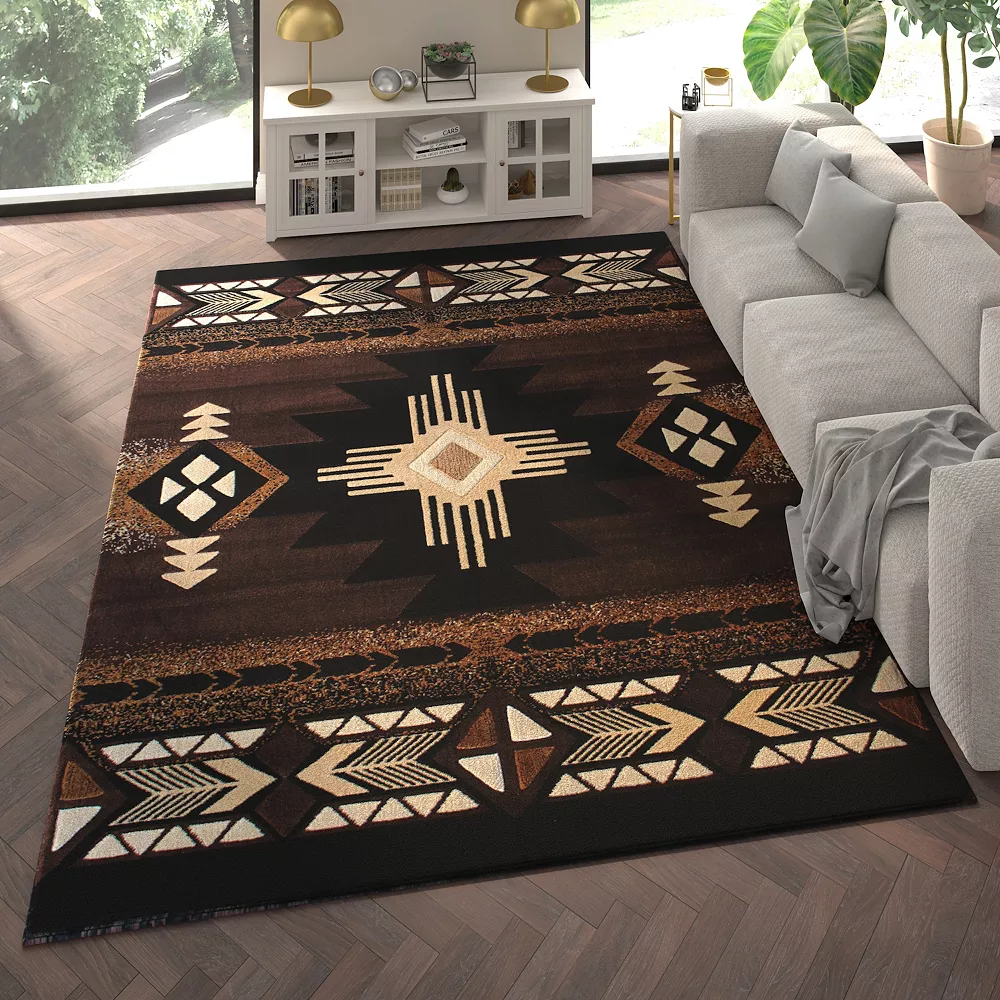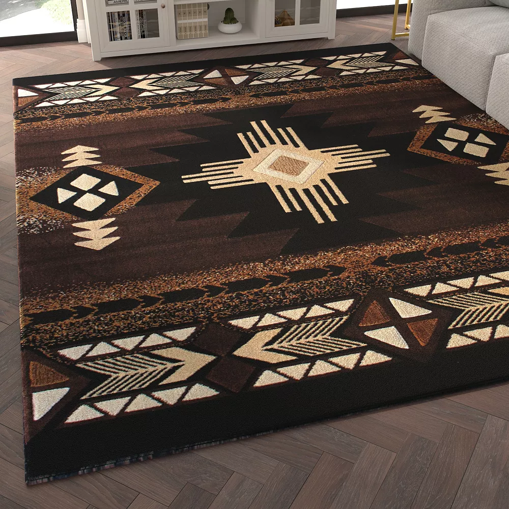 If you’re a fan of Western aesthetics, this is the rug of your dreams. Featuring a vibrant Southwestern geometric pattern against a rich chocolate background, this rug will tie all of your favorite design elements together and complete your Western themed room. The olefin facing is moisture and water soluble stain resistant for your peace of mind. Olefin is also non-shedding and colorfast to last for years to come. The high density fibers give the rug an ultra soft feel underfoot and protect from the chill of cold flooring surfaces such as hardwood and tile. To care for this rug, simply vacuum regularly without a brush roller or spot clean with a diluted solution of clear, mild detergent and water and a dry cloth. Spills should be blotted with a dry cloth. In case of heavy soiling, the rug can be steam cleaned, but shouldn’t be exposed to excessive moisture.