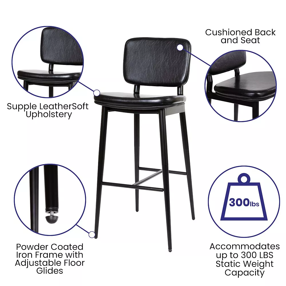 Sleek modern style meets well-crafted comfort in this set of 2 streamlined commercial grade mid-back barstools for your upscale hotel bar. Soft and durable LeatherSoft upholstery over a generously padded back and seat provide a snug but elegant perch to linger over a meal or your morning matcha tea or coffee but is stylish enough to be used as extra seating for guests. The mid-back design assists with posture control but also allows you to maintain movement while seated. The H-shaped integrated footrest eases the pressure from the legs for more comfortable seating. Quality and stability are top priorities for any seating in your home. A sturdy powder coated iron frame with metal screw reinforcements ensures a safe seating experience for your family. Adjustable plastic glides provide a level stool and protect your hard flooring surfaces from scuffs and scratches. Assemble your new dining stools in under 30 minutes with the provided step-by-step illustrated instructions. A dry cloth is all it takes to keep your new barstools looking great. Purchase more than one set of these modern barstools for your pub height dining table, basement bar or just to have on hand for unexpected company.