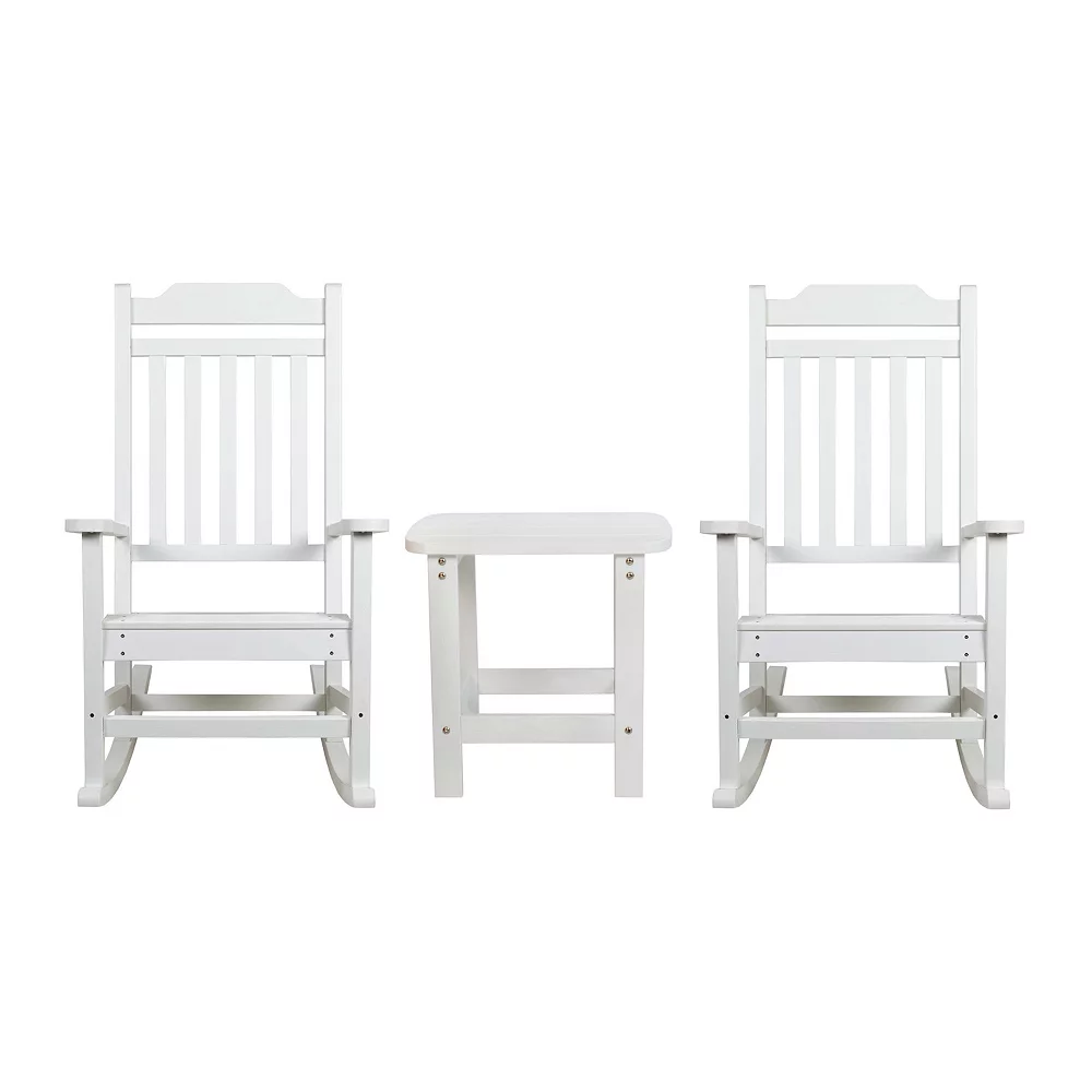 Enjoy the view from your front porch or back deck with this set of 2 poly resin rocking chairs with an included accent table. The design of this seating set is a timeless classic and will create a soothing atmosphere. A perfect addition to your patio, deck, or sunroom, this versatile indoor/outdoor conversation set invites you to settle in and stay awhile. No matter where you choose to spend your free time comfort is essential. These rockers have a full-back design for full support while the sloping runners provide a smooth rocking motion for full relaxation. The handy slatted top side table holds your drinks, snacks or your latest read. Boasting a faux wood look that is UV protected and constructed of weather-resistant polystyrene, this patio table and chair set is designed to hold up in many environments. Unlike traditional wood furniture there is no back breaking sanding, painting or sealing and this low maintenance table and 2 chair set won’t rot, peel or splinter. Easily clean spills, dirt, or dust with water and a neutral detergent. Assembly takes less than 30 minutes with the included tools and illustrated instructions. This all-weather indoor/outdoor seating set beckons you to unwind and let go of the day.