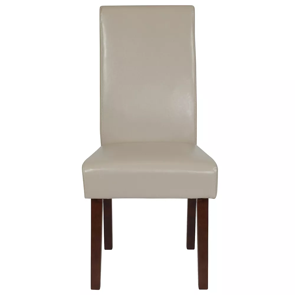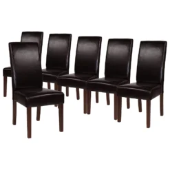 Whether you’re moving into a new home or refreshing your current living space, having a place to relax together for a meal with family and friends or a comfortable place to unwind and indulge in some self care after a long day is a must. This set of six beige faux leather upholstered parsons chairs with generous padding is the versatile seating option you need. Featuring a timeless, panel back design and a solid hardwood frame in mahogany, this chair will be a beautiful addition to your home. The minimalist, armless design serves perfectly as a dining chair or accent seating in the bedroom, living room or foyer and maintains an open feel. With a 300 lb. weight capacity, all of your guests can enjoy a worry free seating experience. Assembly takes less than 30 minutes and the chair cleans easily with vacuuming or light brushing.