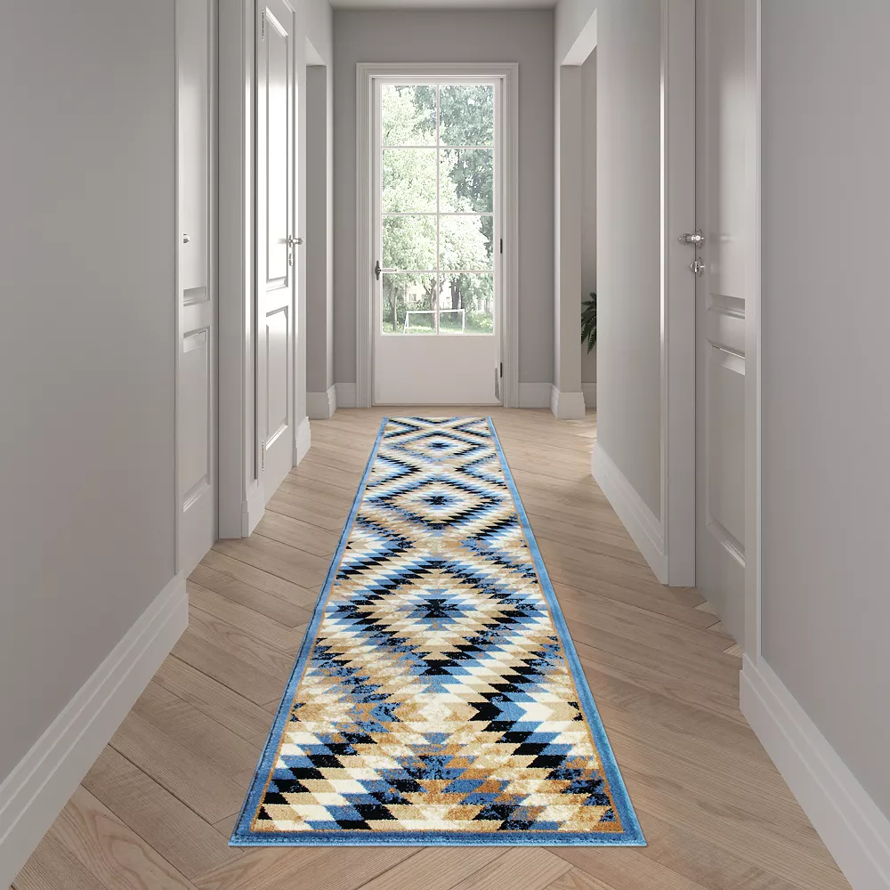 Give your home a style upgrade with this plush accent rug. Featuring a traditional Southwestern diamond motif in a distressed modern palette of blue, beige, brown and black, it’s the best of both worlds. The olefin facing is fade and stain resistant to stay looking beautiful longer. Whether you’re decorating in farmhouse, cabin or modern style, this rug makes a perfect accent piece in any room. Available in multiple sizes, you can even carry this design throughout your home for a cohesive feel. This is the perfect rug to relax on for family game or movie nights with it’s ultra soft texture and if you live in a home with children and pets, you’ll love the low maintenance upkeep. Simply vacuum regularly and spot clean when needed with a diluted mixture of clear, neutral detergent and water. For heavier messes, steam clean on the lowest moisture setting for best results.