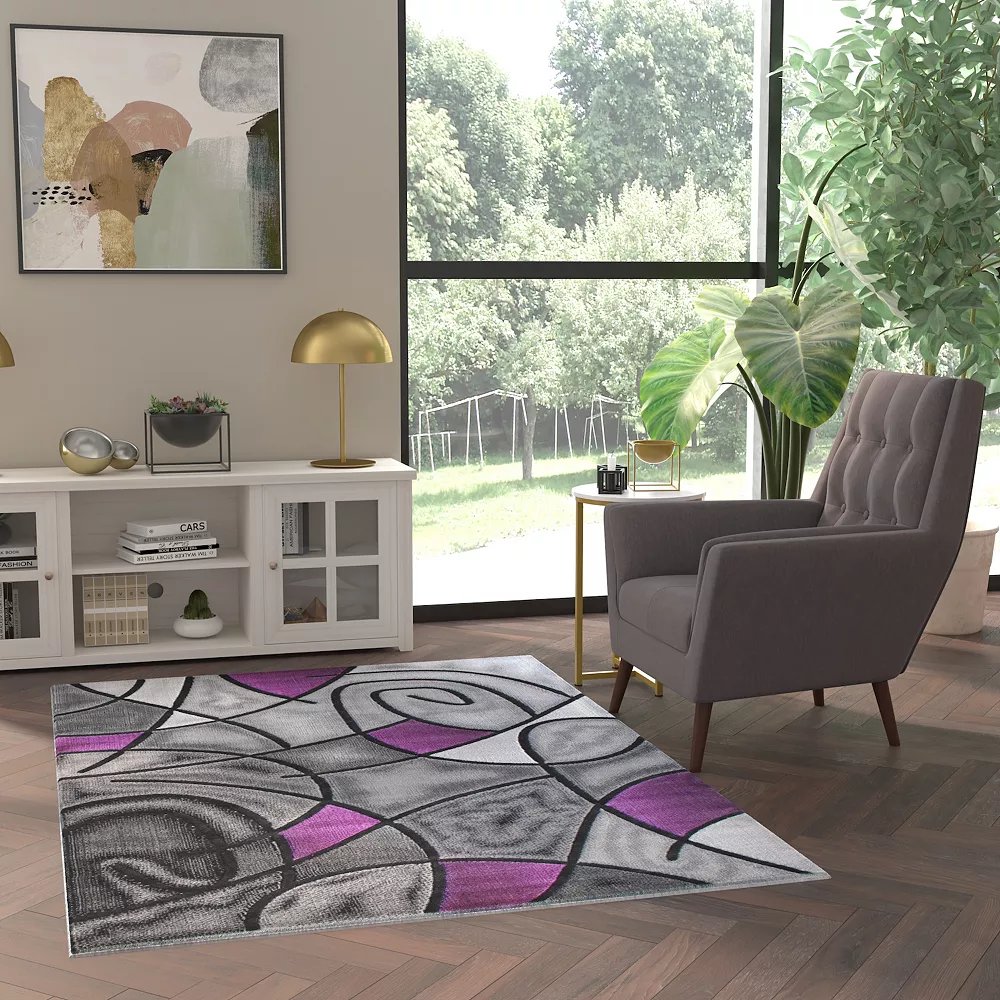 If you are looking for a unique statement piece for your home, consider this decorative accent rug. Featuring a unique, artistic contemporary pattern with abstract geometric swirls and lines in gradient shades of gray with vibrant purple accents, this rug is an eyecatcher. Area rugs help to reduce noise in your home and insulate you from the chill of colder flooring like hardwood, laminate and tile. Equally beautiful and practical, you’ll be glad you made this purchase. With simple upkeep, this rug can stay looking fresh longer. Vacuum regularly without a roller brush and spot clean when needed with a diluted mixture of clear, neutral detergent and water and a dry cloth. For heavier messes, this rug can be steam cleaned, while avoiding exposure to excess moisture for longer lasting style. Backed with natural jute for use on multiple flooring types.