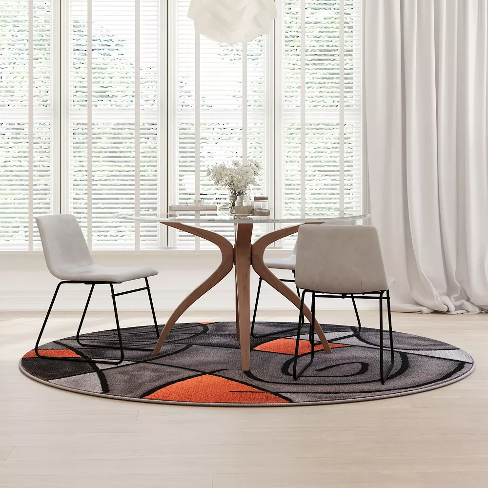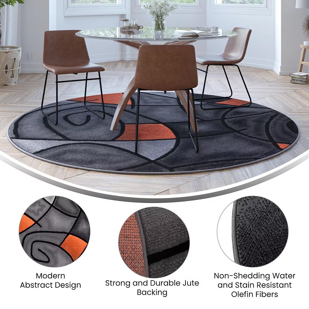 Modern art looks great in more places than just on the wall with the distinctive abstract pattern of this round accent rug. This versatile contemporary accent rug allows you to add warmth to hardwood floors, add color in multiple spaces, and protects flooring in high-traffic areas. This high pile area rug can be a warm place for your feet by the bed or an accent in your design scheme. Modern rugs provide several benefits in the home. Made from olefin fibers, this cutting edge area rug is stain and water resistant, colorfast, and provides a soft underfoot feel friendly to kids and pets. The jute backing gives this rug structural integrity and helps promote air flow. Vacuum regularly without the beater bar and spot clean with water and a mild detergent to maintain the look of your new rug.