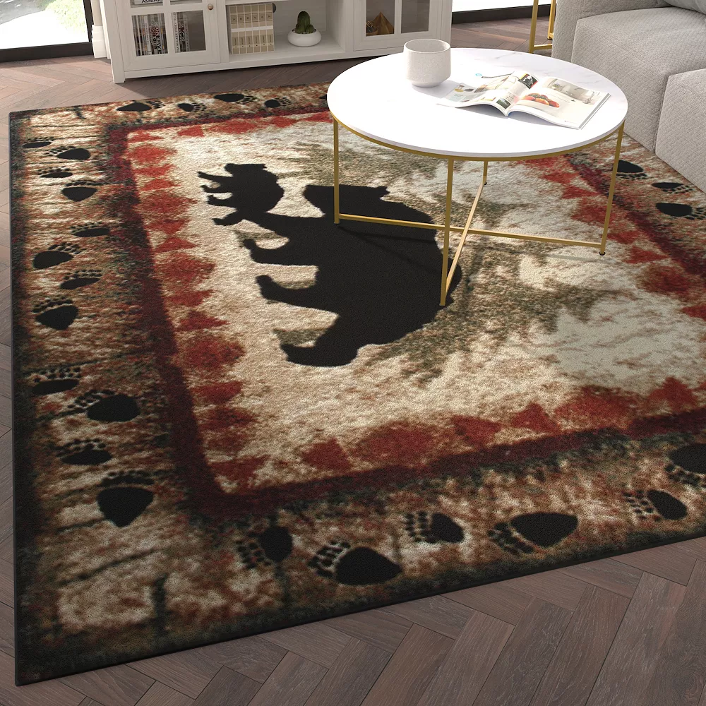 Bring a cozy cabin feel into your home with this rustic area rug. Featuring a bear and cub nature motif with green trees in the background, a red accent border and bear track pattern around the edge, this rug will make any room feel like a rustic mountain lodge. Crafted with olefin for an ultrasoft feel and jute backing for long lasting use. Olefin is naturally moisture and water soluble stain resistant and non-shedding and colorfast, perfect for a home with pets or children. To care for this rug, simply vacuum regularly without a brush roller or spot clean with a diluted solution of clear, mild detergent and water and a dry cloth. Spills should be blotted with a dry cloth. In case of heavy soiling, the rug can be steam cleaned, but should not be exposed to excessive moisture to preserve the fibers.