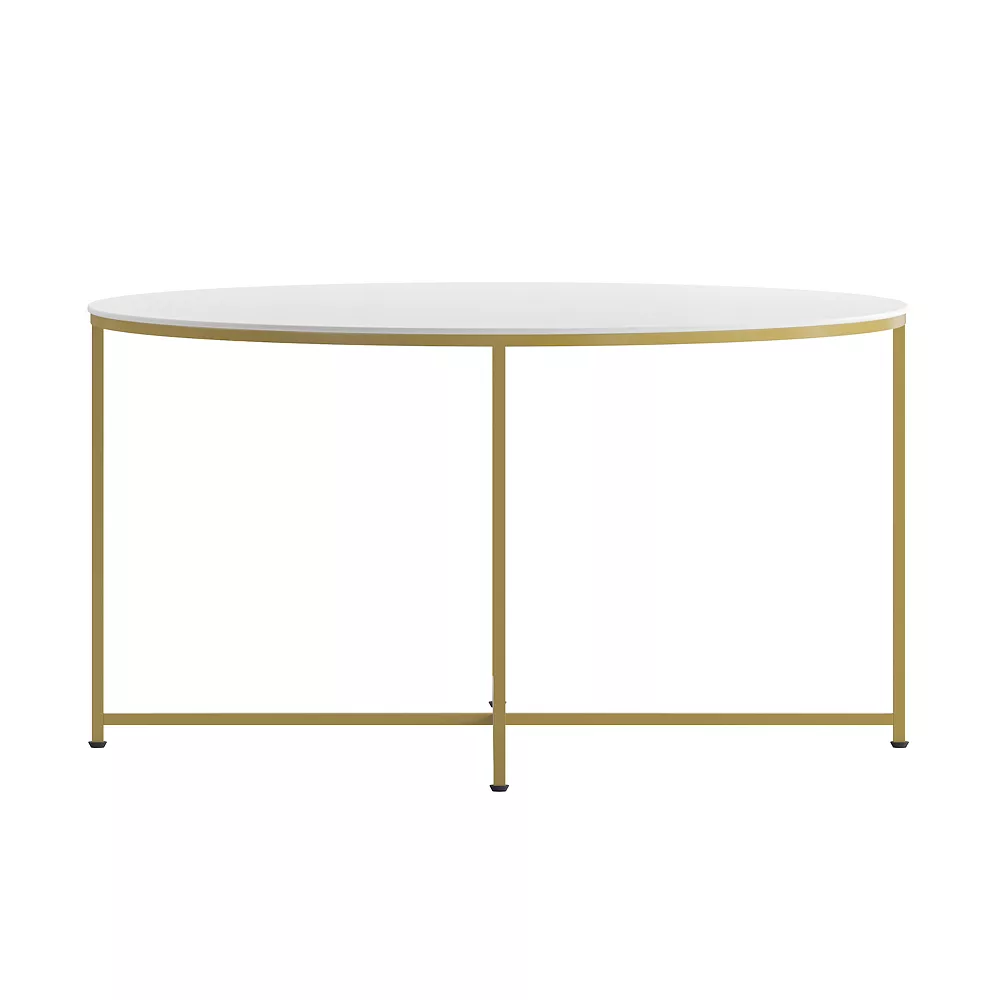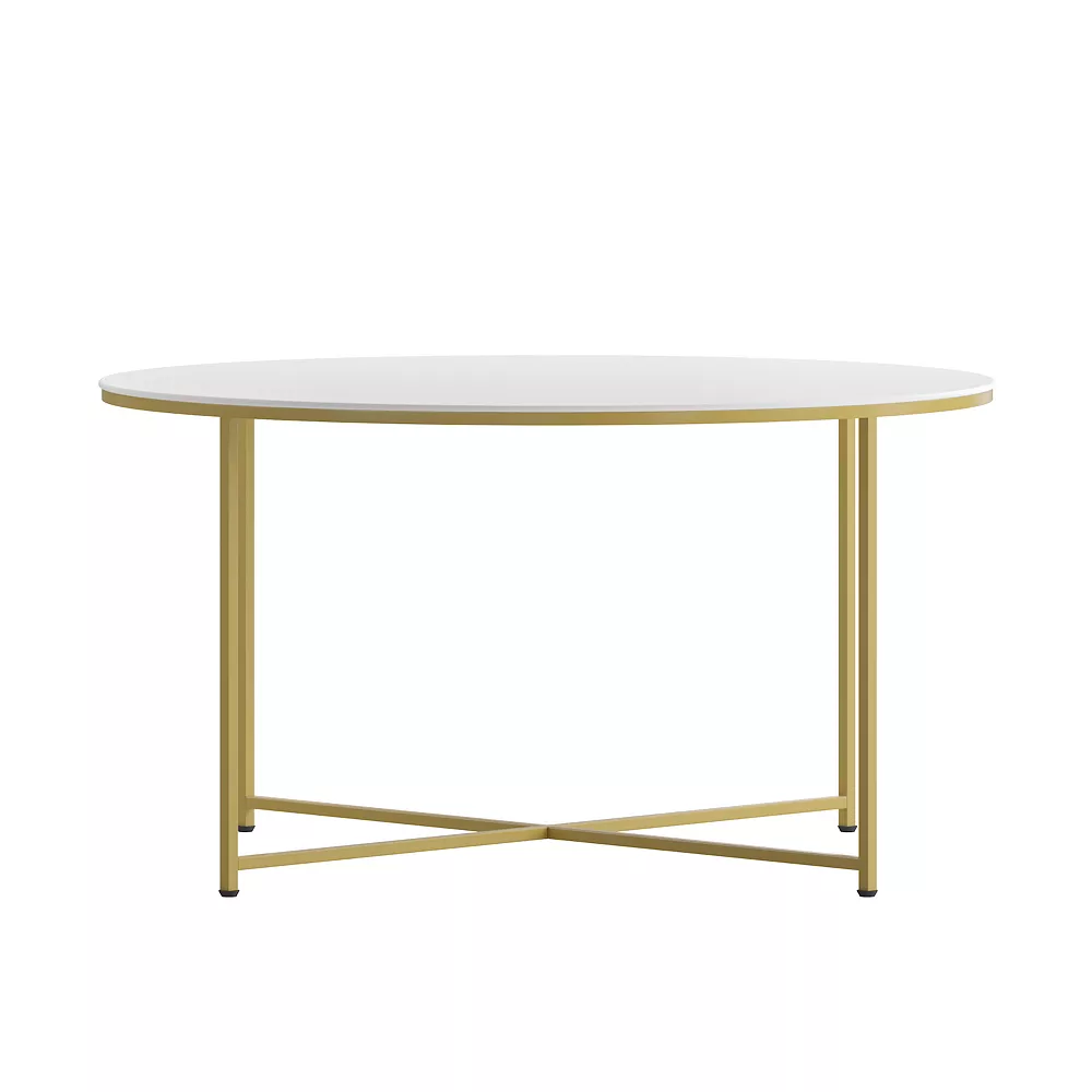 Update the atmosphere in your home with the sophisticated, polished look of this mixed media coffee table. Featuring a marbled white finished laminate top, this occasional table blends seamlessly in any space. The round shape atop modern crisscross brushed gold metal legs completes the overall look of this stunning piece. Whether you’re serving coffee, tea, or just want a place for decorative items, you will never have to worry about the safety of this table. The strong .5 inch thick engineered wood top stands up to daily use while the sturdy cross brace metal frame holds up to 55 lbs. static weight capacity. A durable powder coated finish ensures this living room table will look great for years to come. Have your new coffee table ready to use in under 30 minutes with the included step-by-step instructions and included tools. Floor glides will protect your hard flooring surfaces from scuffs and scrape and messes clean up quickly and easily with a water based cleaner.