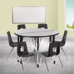 Emma And Oliver Mobile 47.5″ Circle Wave Activity Table Set-18″ Student Stack Chairs, Grey/Black