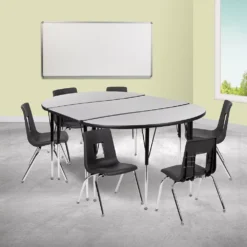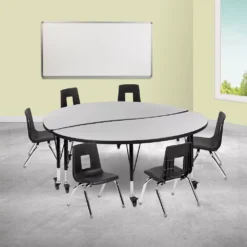 Emma And Oliver Mobile 47.5″ Circle Wave Activity Table Set-16″ Student Stack Chairs, Grey/Black