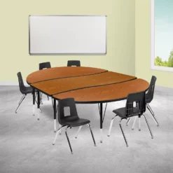 Emma And Oliver 86″ Oval Wave Activity Table Set With 18″ Student Stack Chairs, Oak/Black