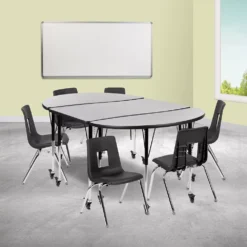 Emma And Oliver Mobile 76″ Oval Wave Activity Table Set-18″ Student Stack Chairs, Grey/Black