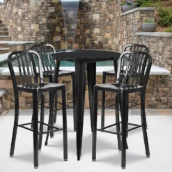 Emma And Oliver Commercial Grade 24″ Round Blue Metal Bar Table Set-4 Vertical Slat Back Stools