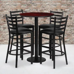 Emma And Oliver Commercial 30″ Round Silver Metal Bar Table Set-4 Vertical Slat Back Stools
